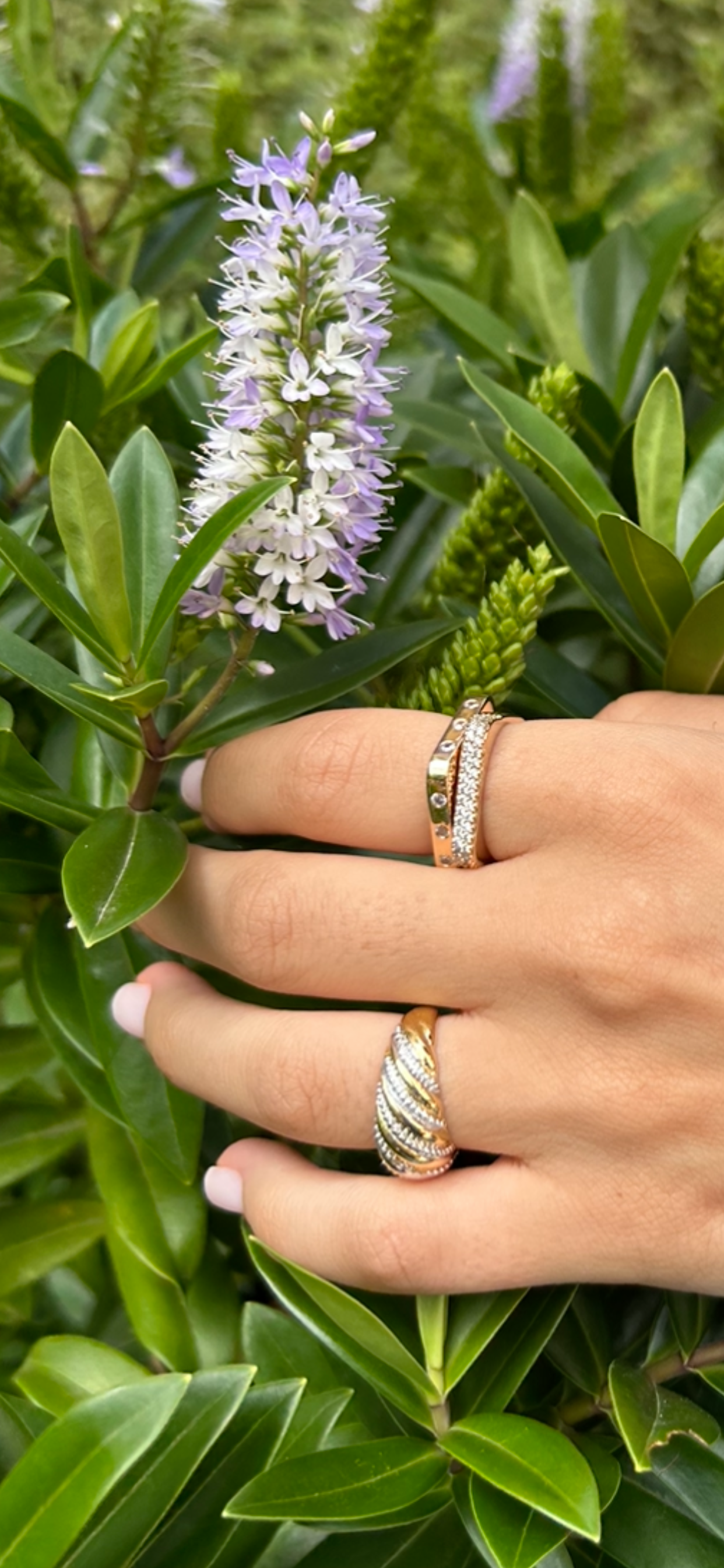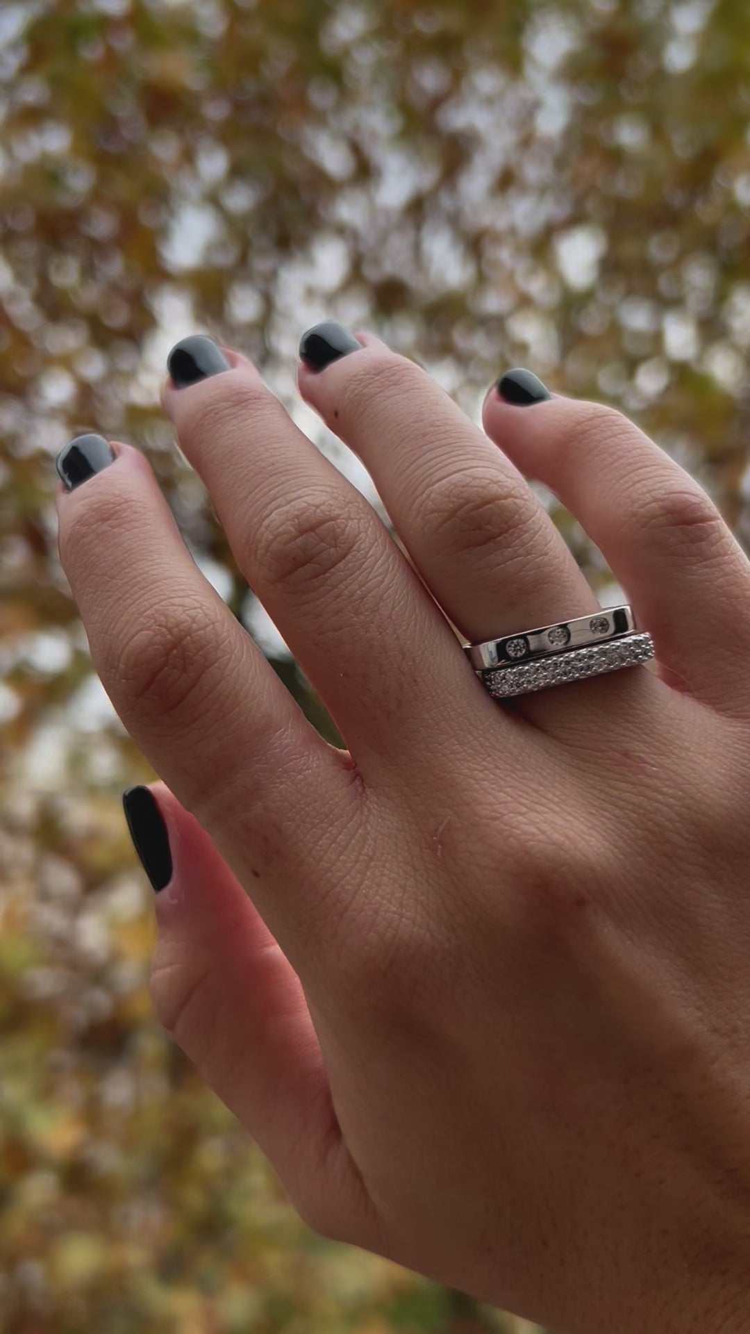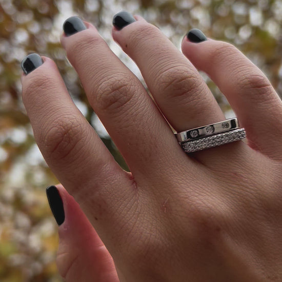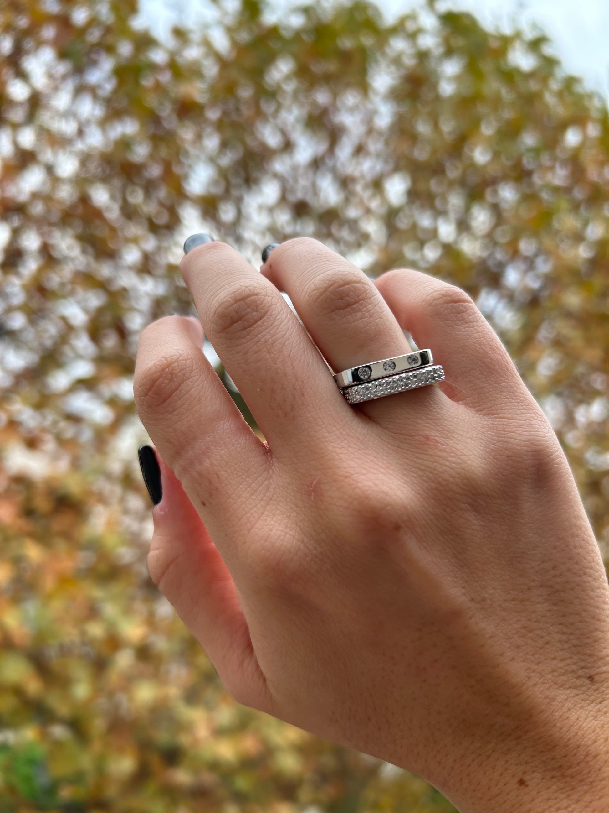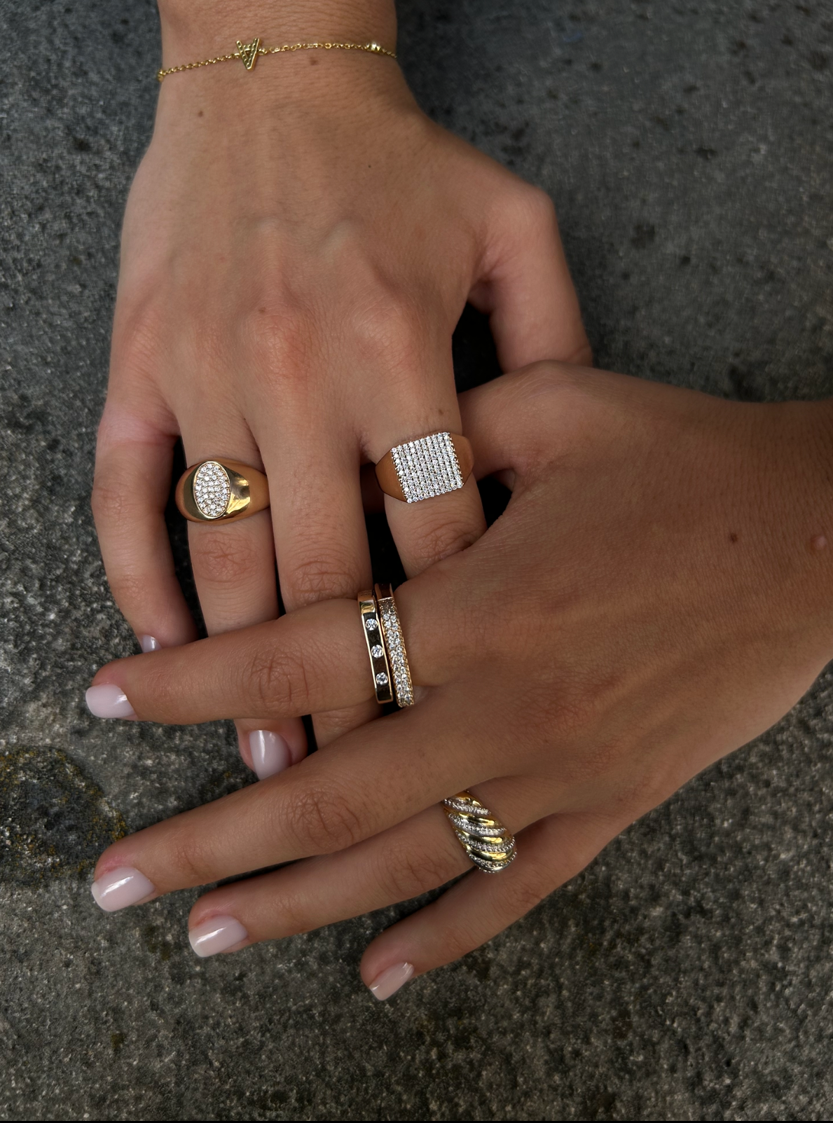 Élégance et simplicité se marient dans les bagues Manchester : deux bagues carrées en plaqué or 18 carats ou Argent , une pavée de zircons blancs et l'autre ornée de points strass en zircons blancs. L'union parfaite de l'élégance et de la sophistication.