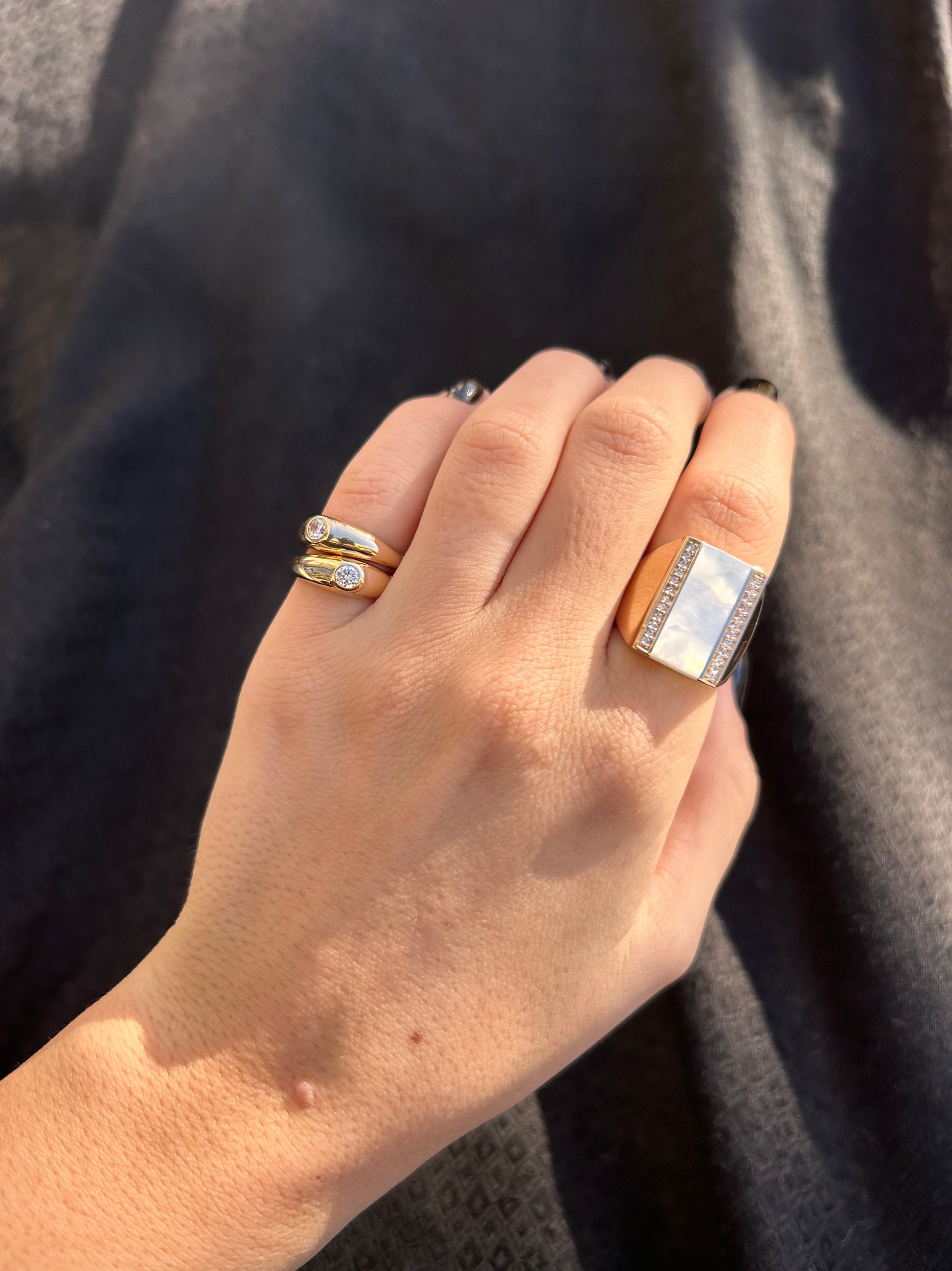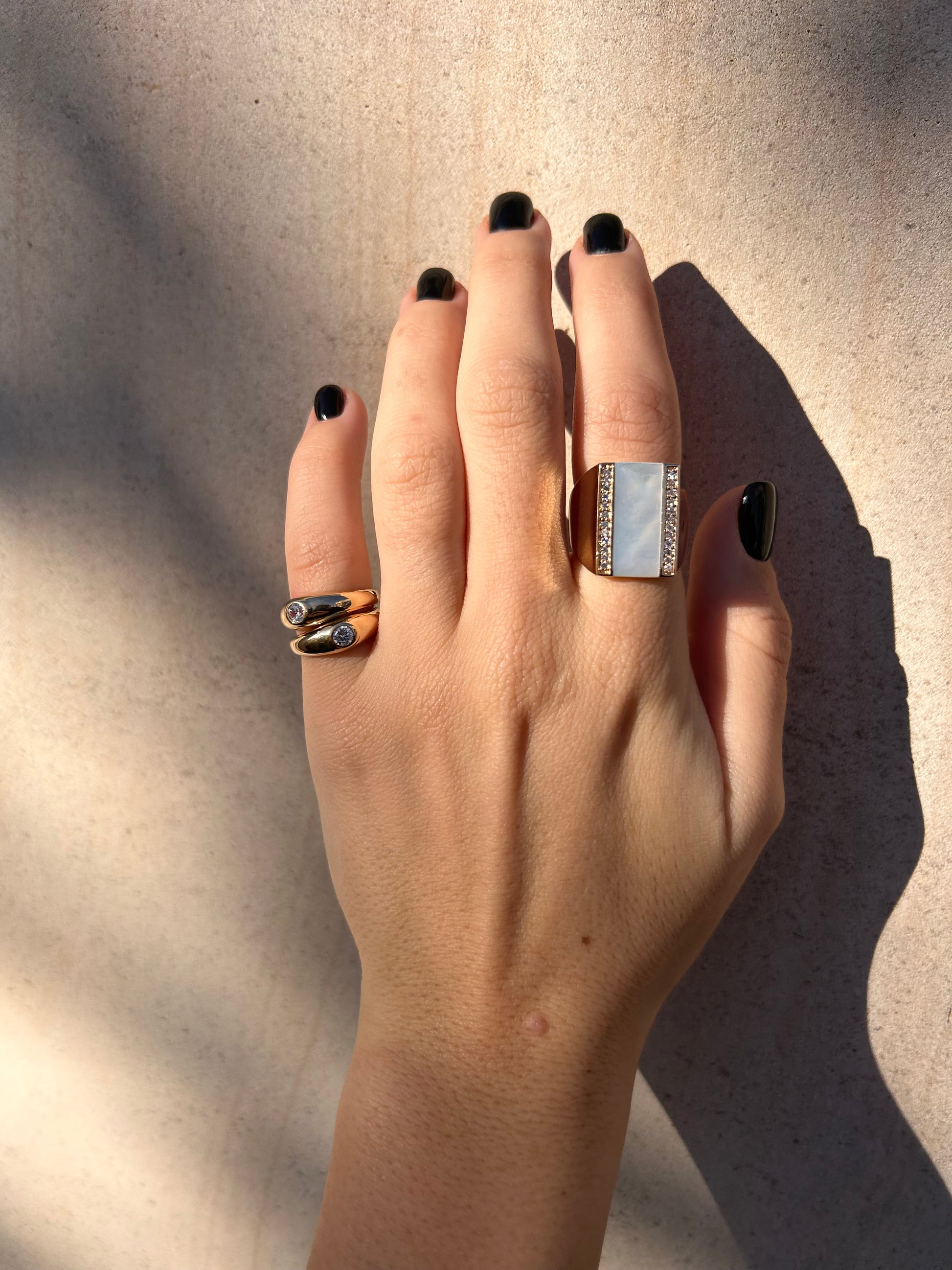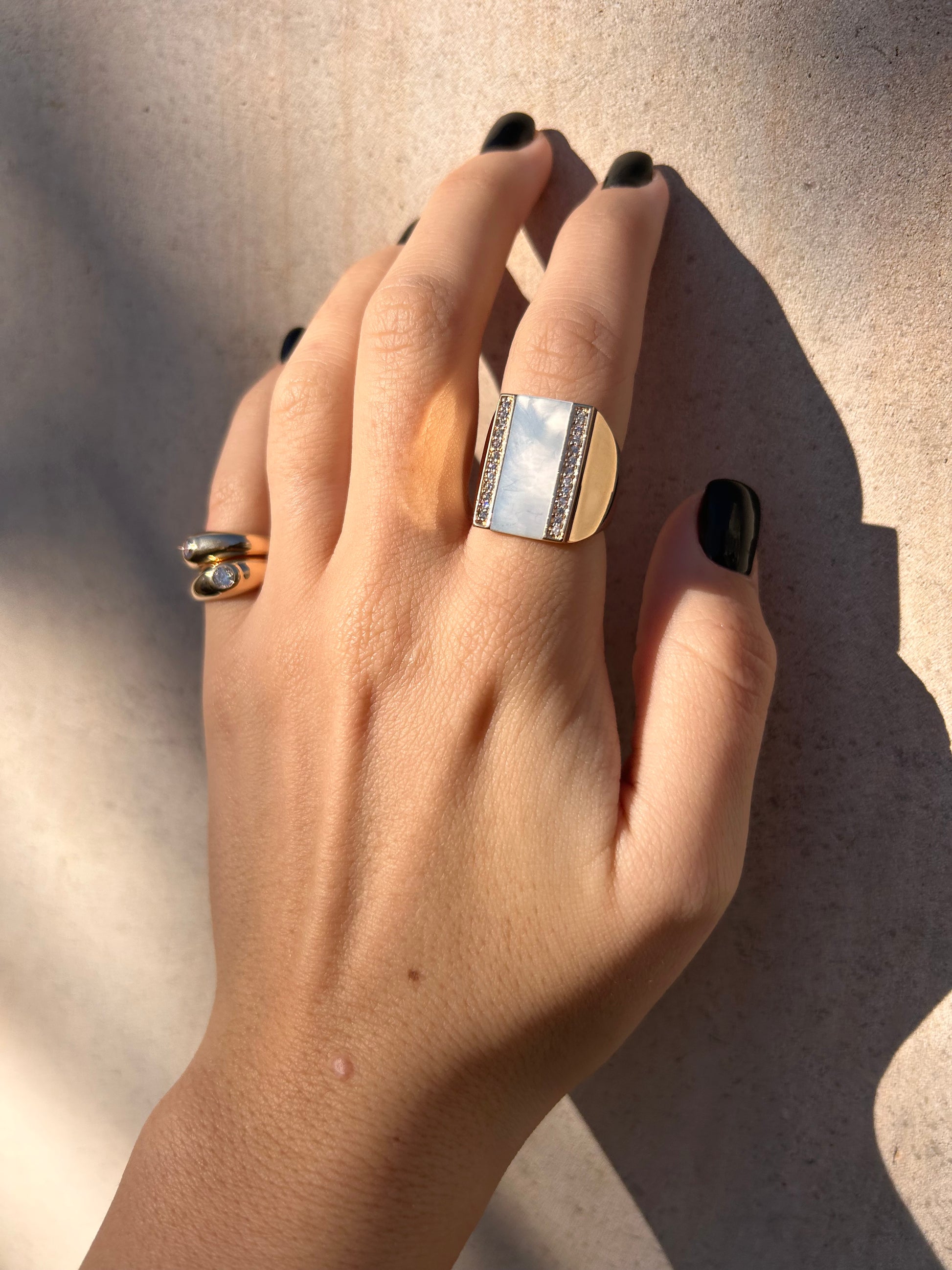 Grosse bague en plaqué or 18 carats, ornée d’une plaque centrale, effet marbre blanc, élégamment encadrée de zircons scintillants. Un bijou audacieux et raffiné, parfait pour ajouter une touche sophistiquée à votre style.