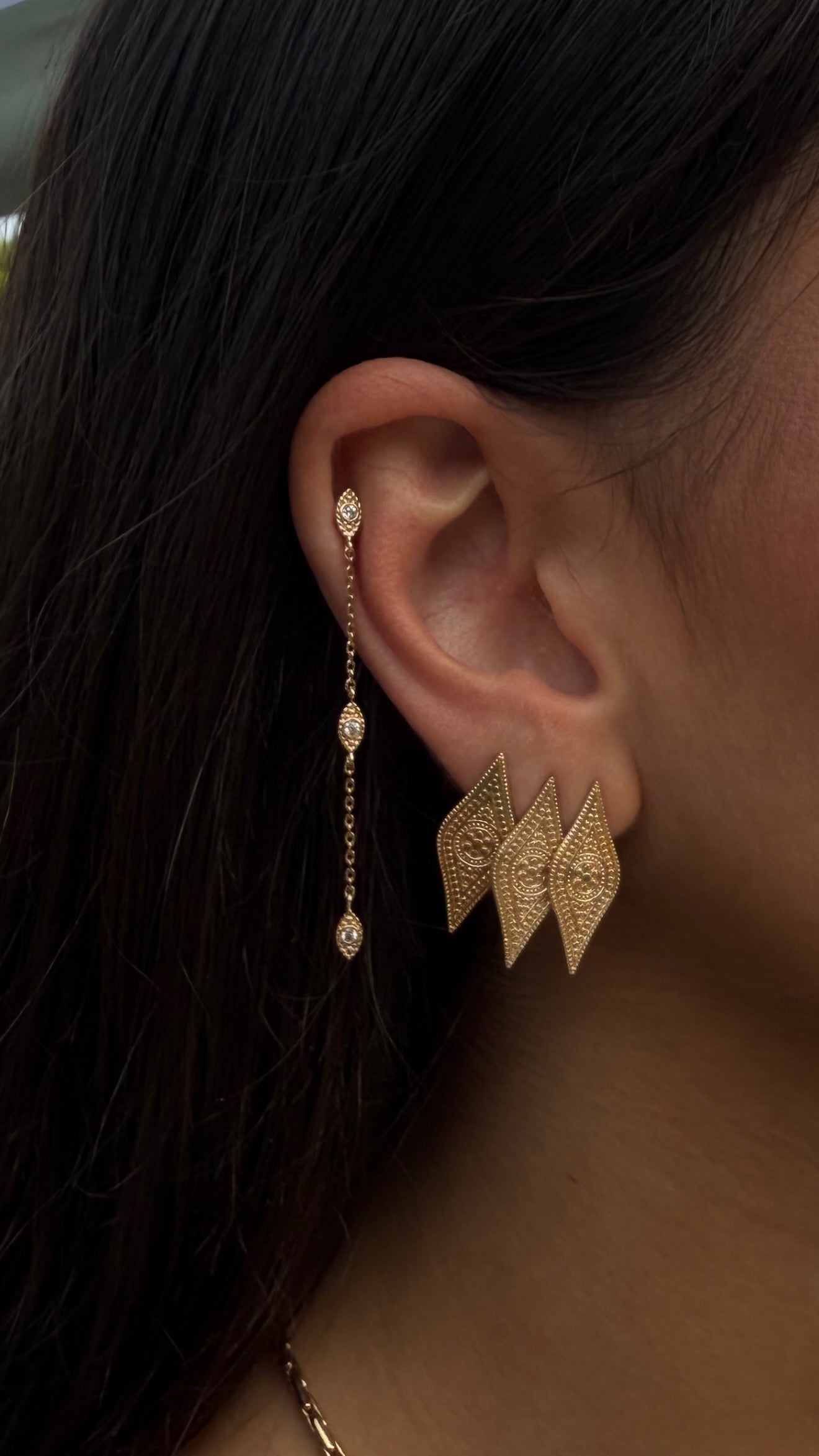 Une boucle d'oreille pendante fine et raffinée, qui se porte aussi bien en piercing qu'en boucle d'oreille classique. Son design géométrique et léger ajoute une touche d'élégance à toutes vos tenues.